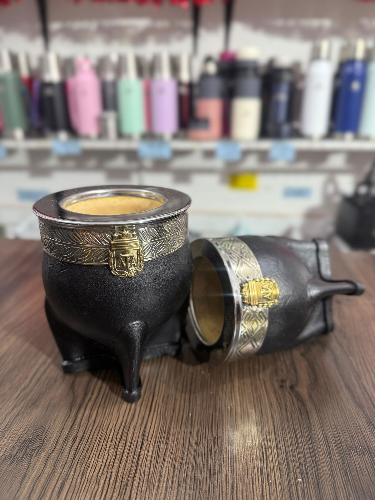 Mate calabaza tipo imperial de cuero liso con virola de acero inoxidable y logo de AFA