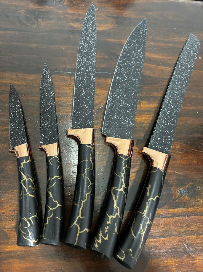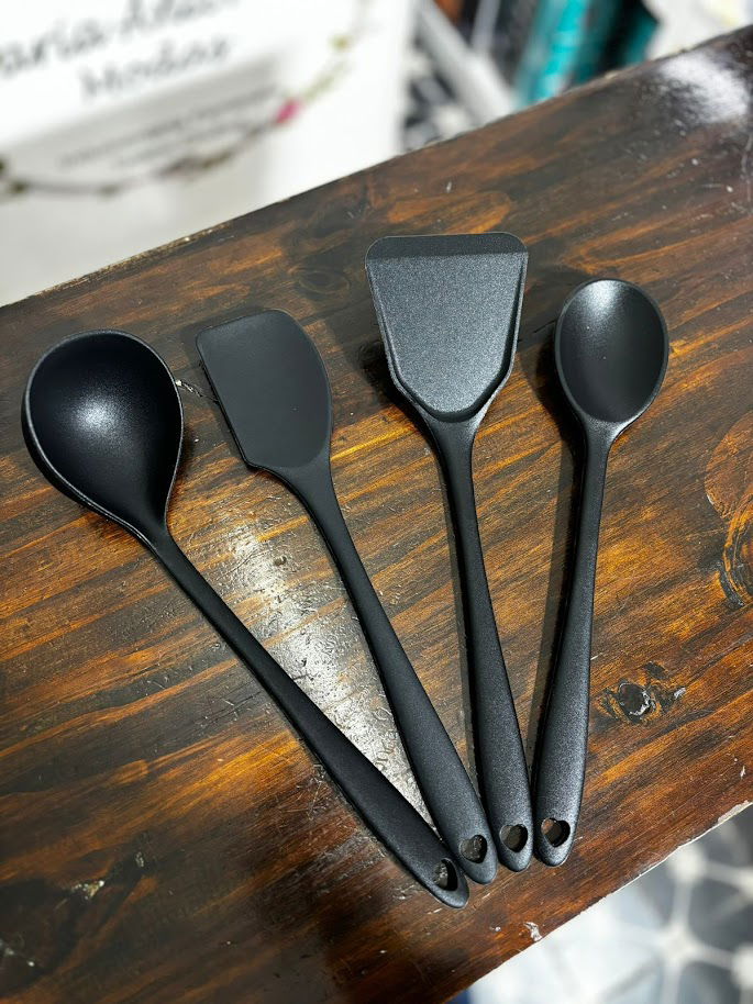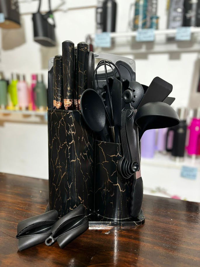 Incluye 19 piezas: - 5 tipos diferentes de cuchillos - 9 tipos de cucharones y espatulas diferentes - 1 tijera - 1 mezclador - 1 tabla de cortar - 1 Reipiente doble para colocar los utensilios (21 cm ancho x 23,5 cm alto)