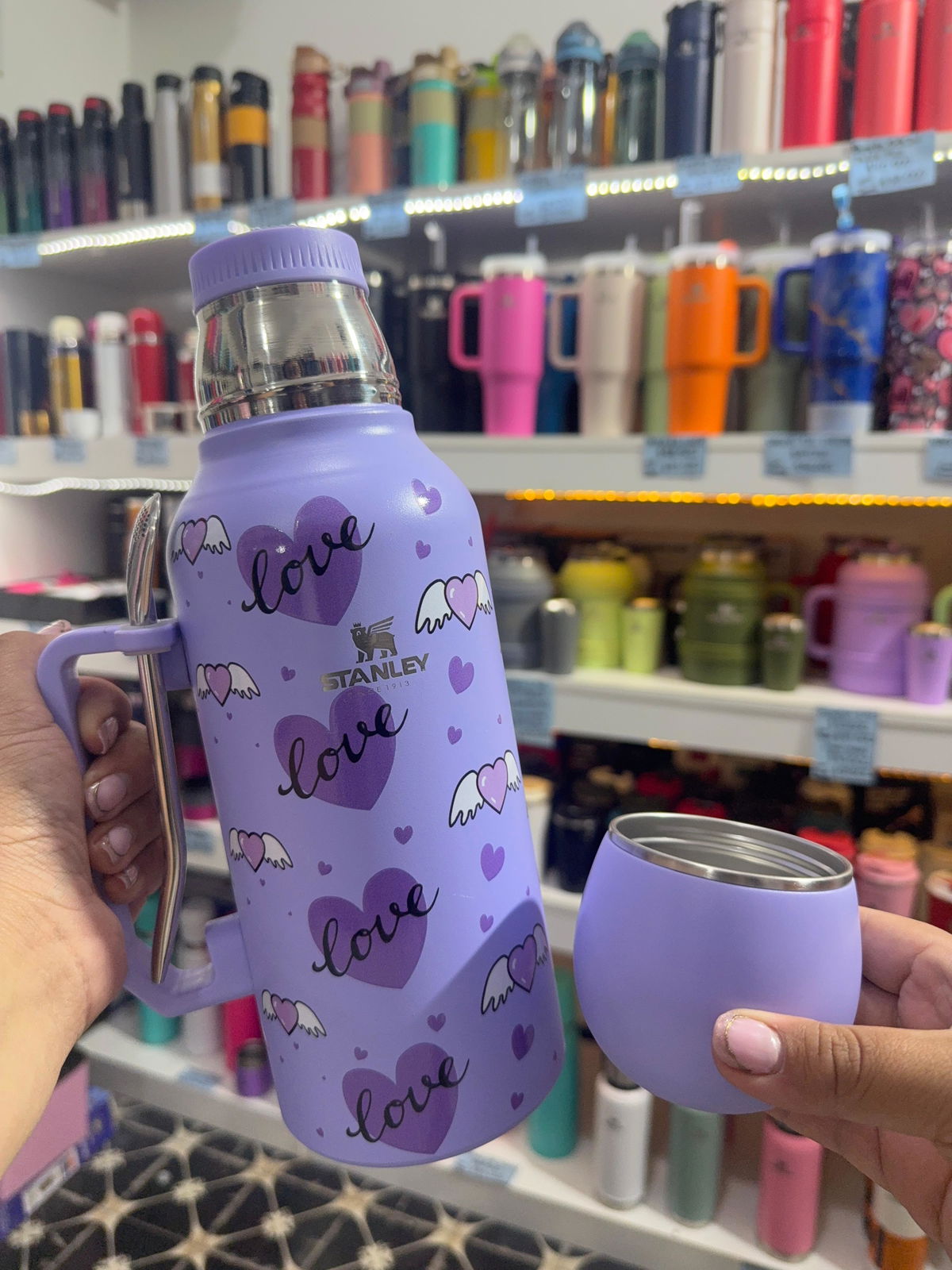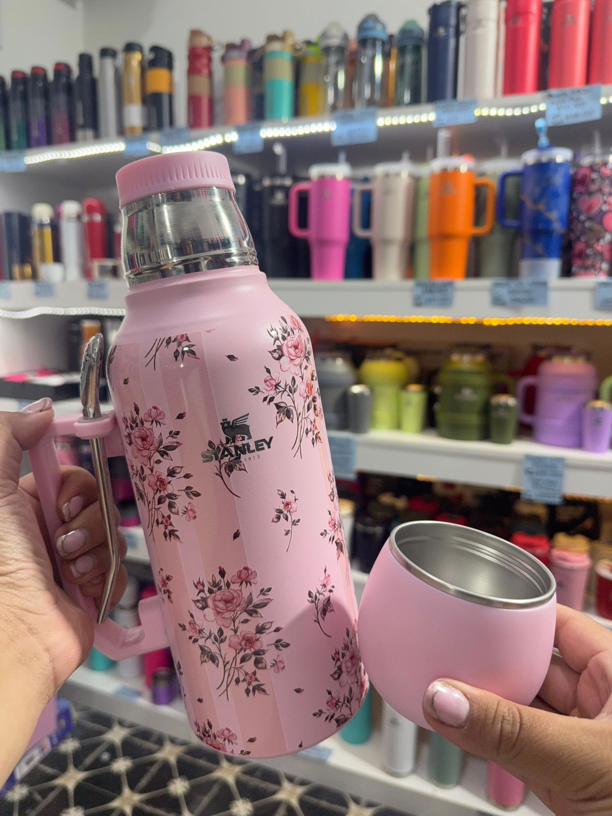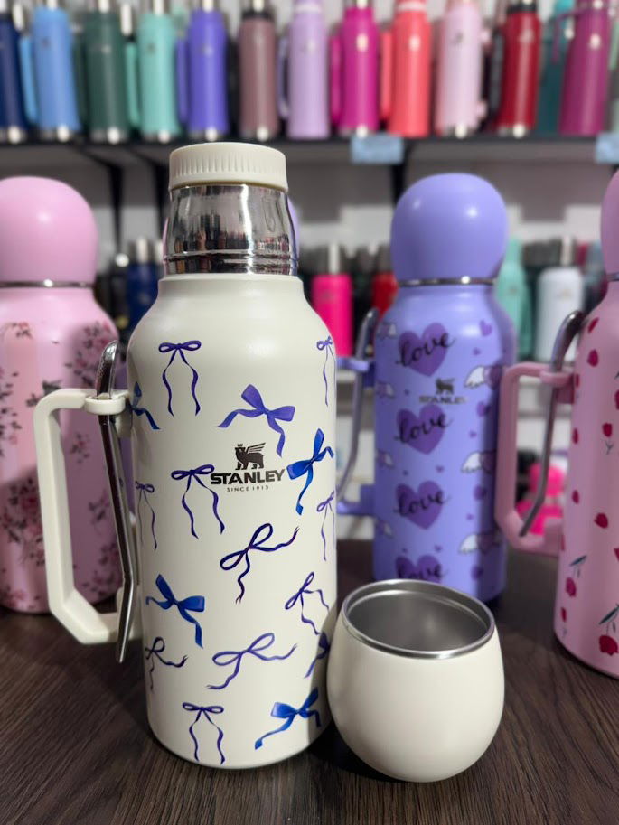 Termo astronauta estampado de 1,3 litros con manija, 3 en 1. De acero inoxidable con doble capa de acero.