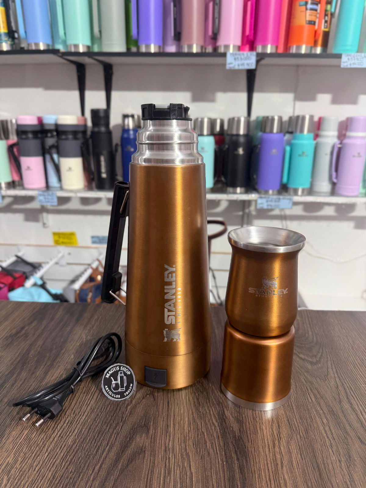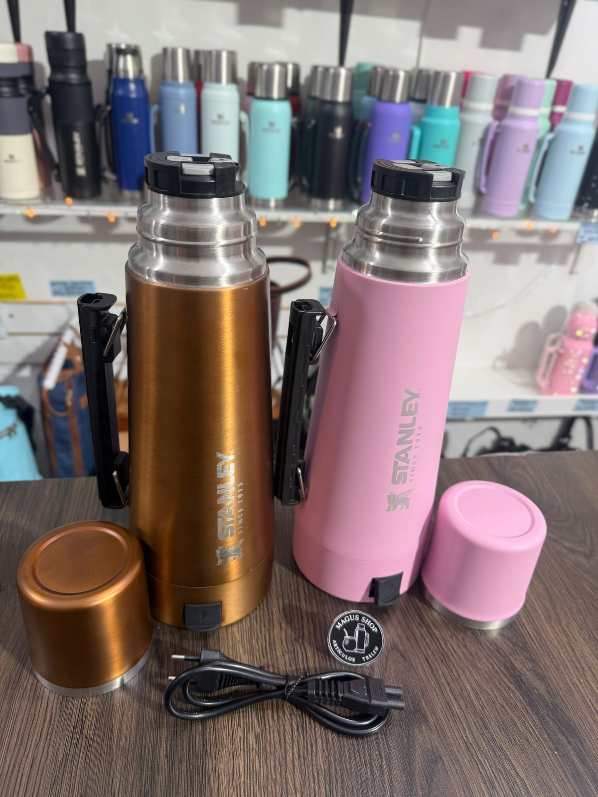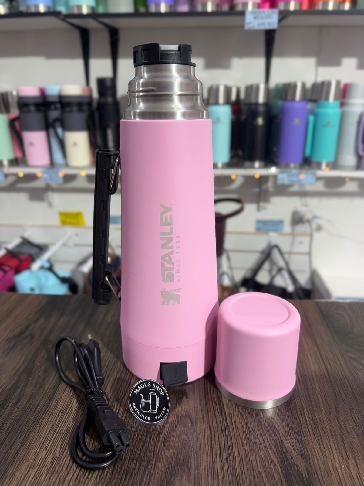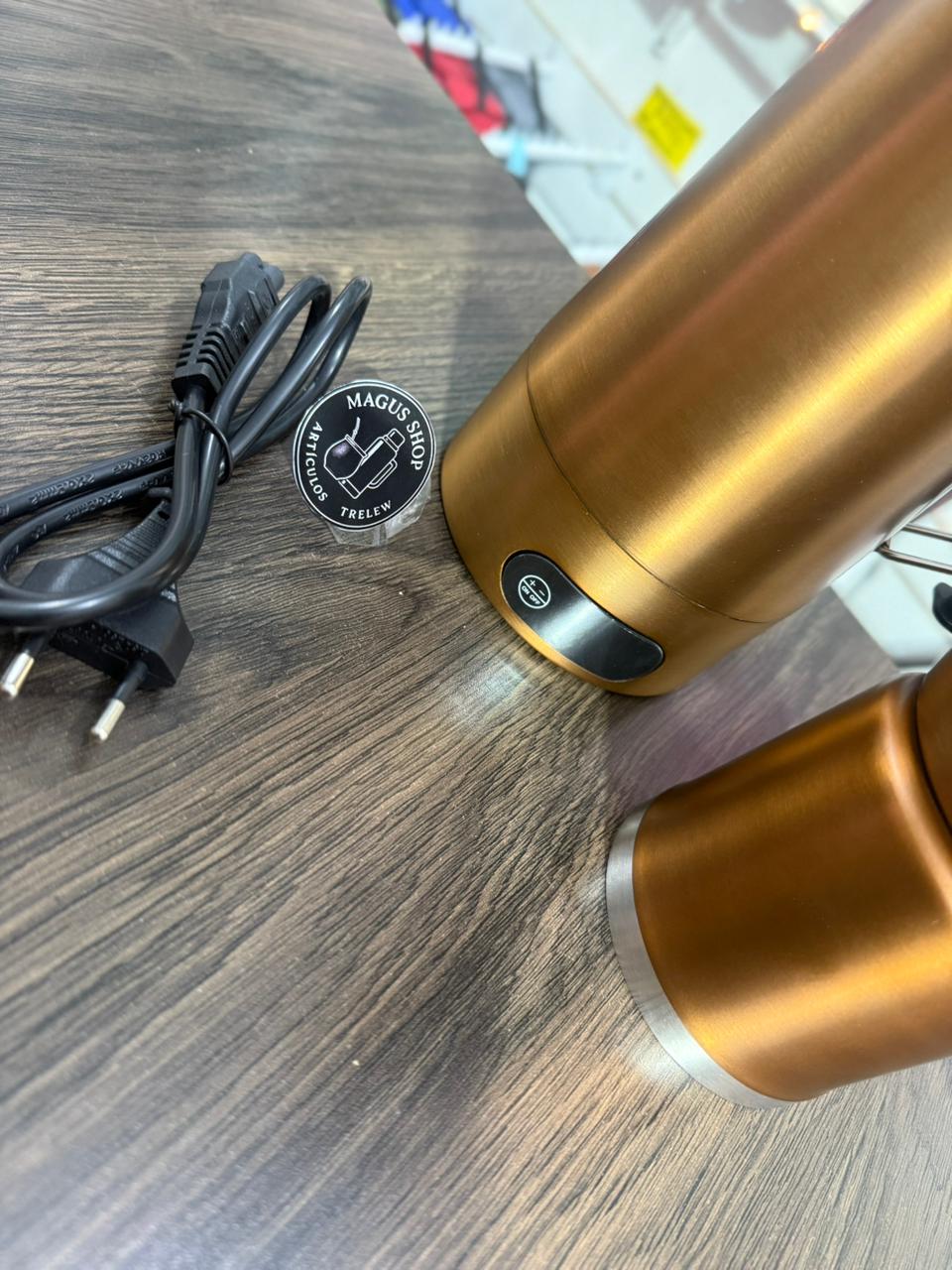 Termo eléctrico de 1,2L con manija. De acero inoxidable con doble capa de acero. Incluye cable cargador. Con pico a presión.