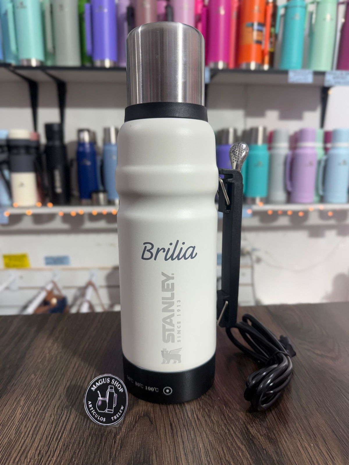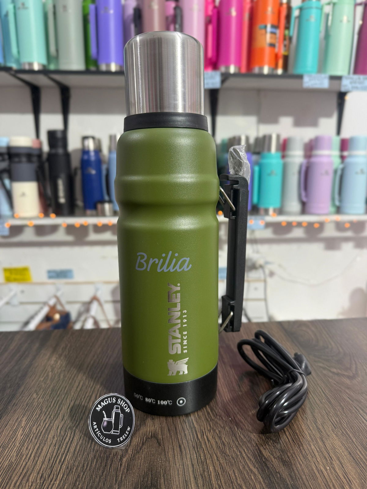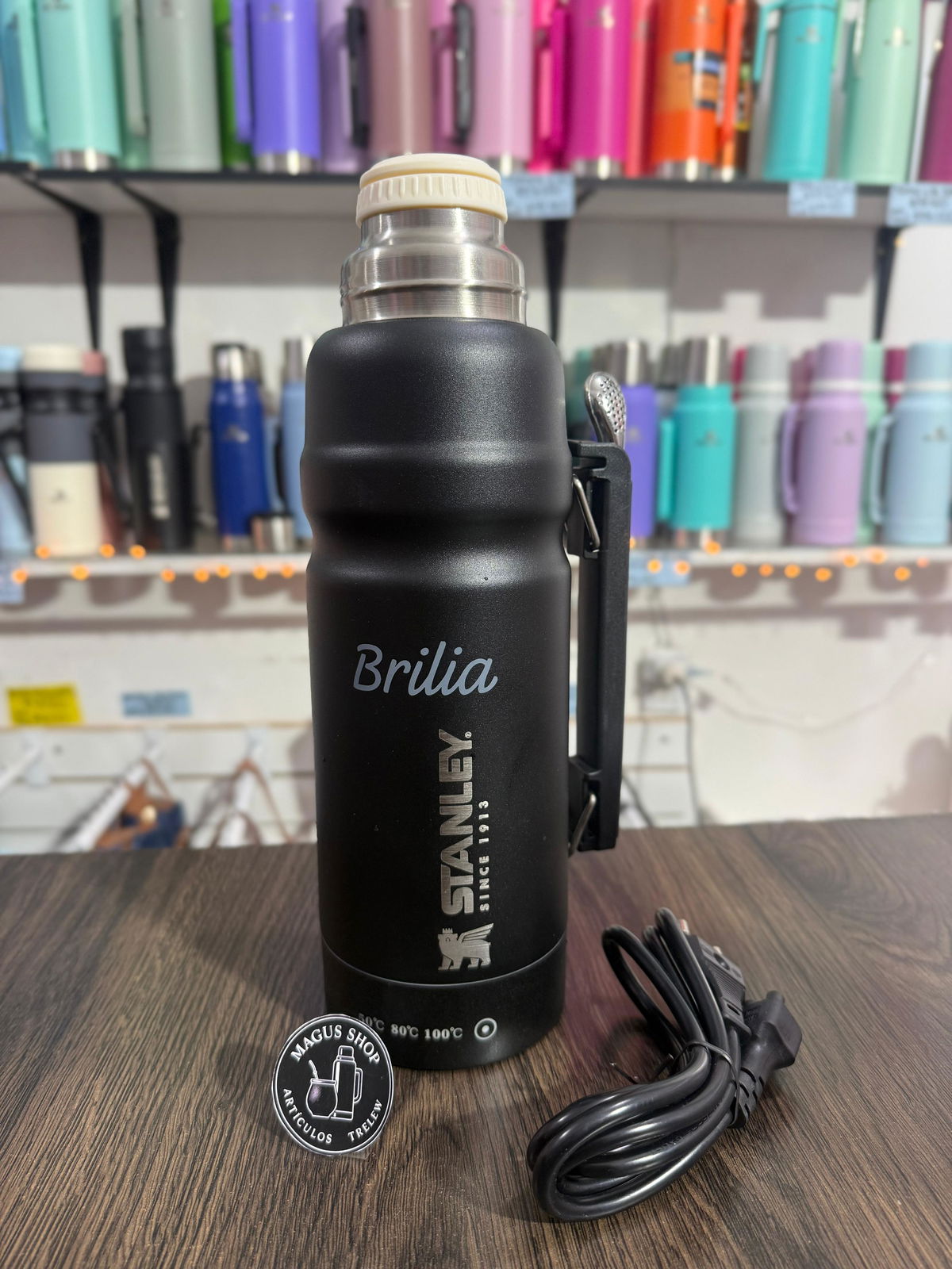 Termo eléctrico de 1 litro con manija. De acero inoxidable con doble capa de acero. Incluye cable cargador. Con pico a presión.